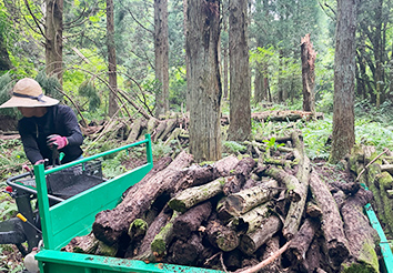 自然の循環を念頭にさまざまな活動も行っており、山でろ過された川の水がおいしいお米を作れるよう、古くなった広葉樹の伐採などで山の更新作業をおこなっています。伐採した木はしいたけのほだ木に活用しています。
